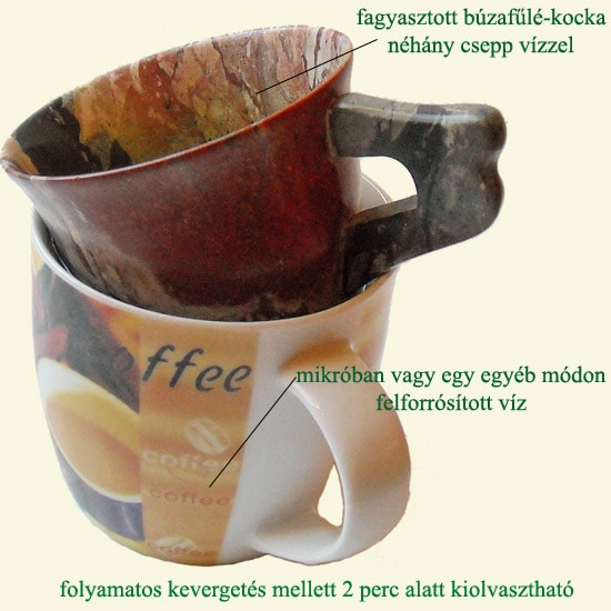 Javaslat: egy kávéscsészébe tegyük bele a fagyasztott búzafűlé-kockát, öntsünk alá néhány csepp vizet (hogy a kávéscsésze falával minél szorosabban érintkezzen), majd helyezzük bele egy forró vízzel töltött edénybe, bögrébe (kép ide kattintva videó ide kattintva). 0,5 percet várva megindul az olvadás, miután 1 percig kevergetve/mozgatva már ki is olvadt. Mivel “ÉLŐ ÉTEL”, kb. 20 percen belül el kell fogyasztani! FONTOS: ha tényleg forró vizet tettünk alá hogy gyorsan kiolvasszuk, ne hagyjuk magára a búzafűlét mert a hőt nem bírja, viszont ha a fent leírtakat betartjuk, állandóan kevergetve a még fagyott kockát az kiolvad pillanatok alatt úgy hogy még hűtőhideg marad (az alatta lévő forró víz ellenére!).
